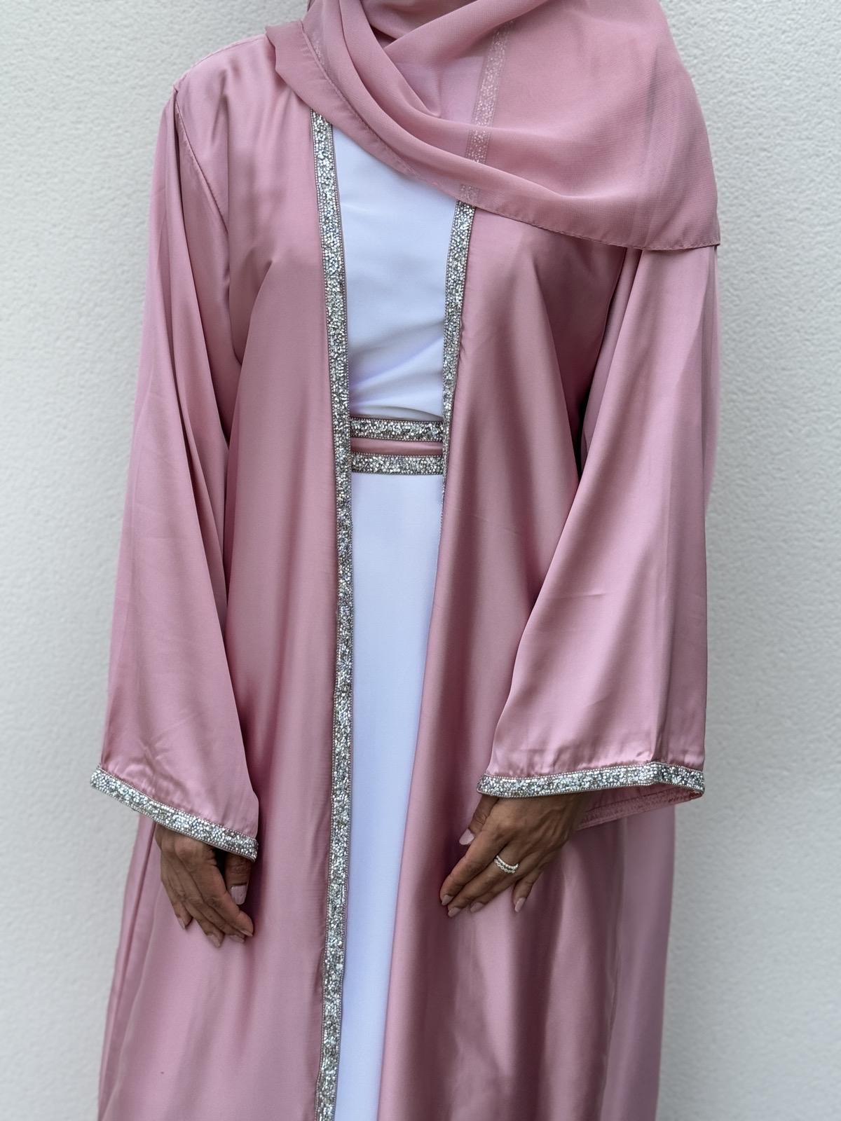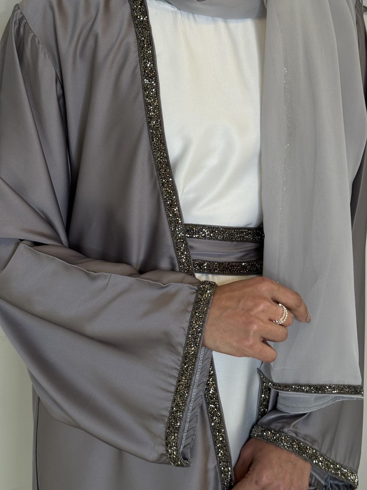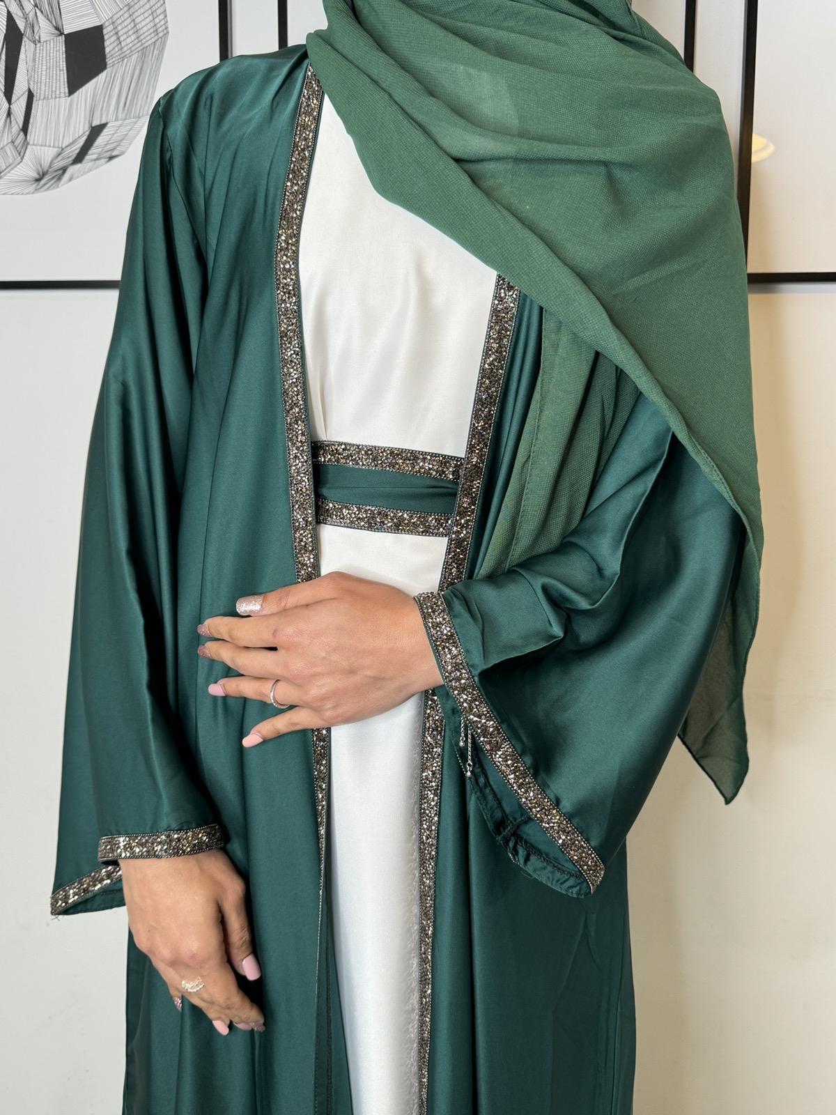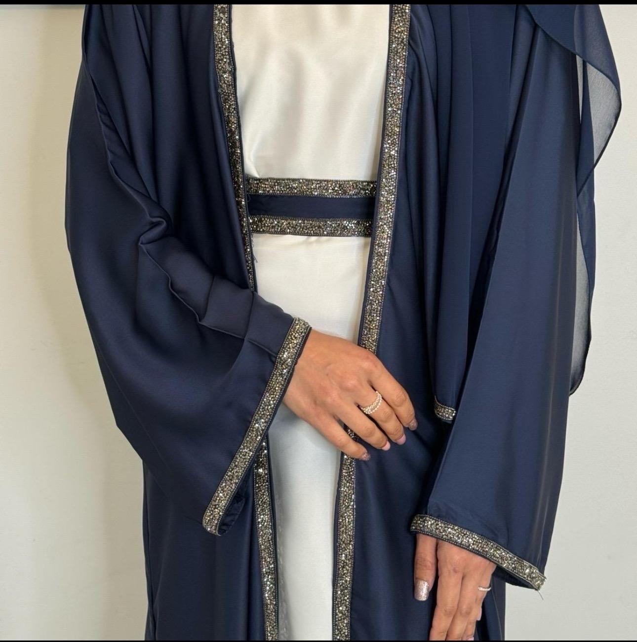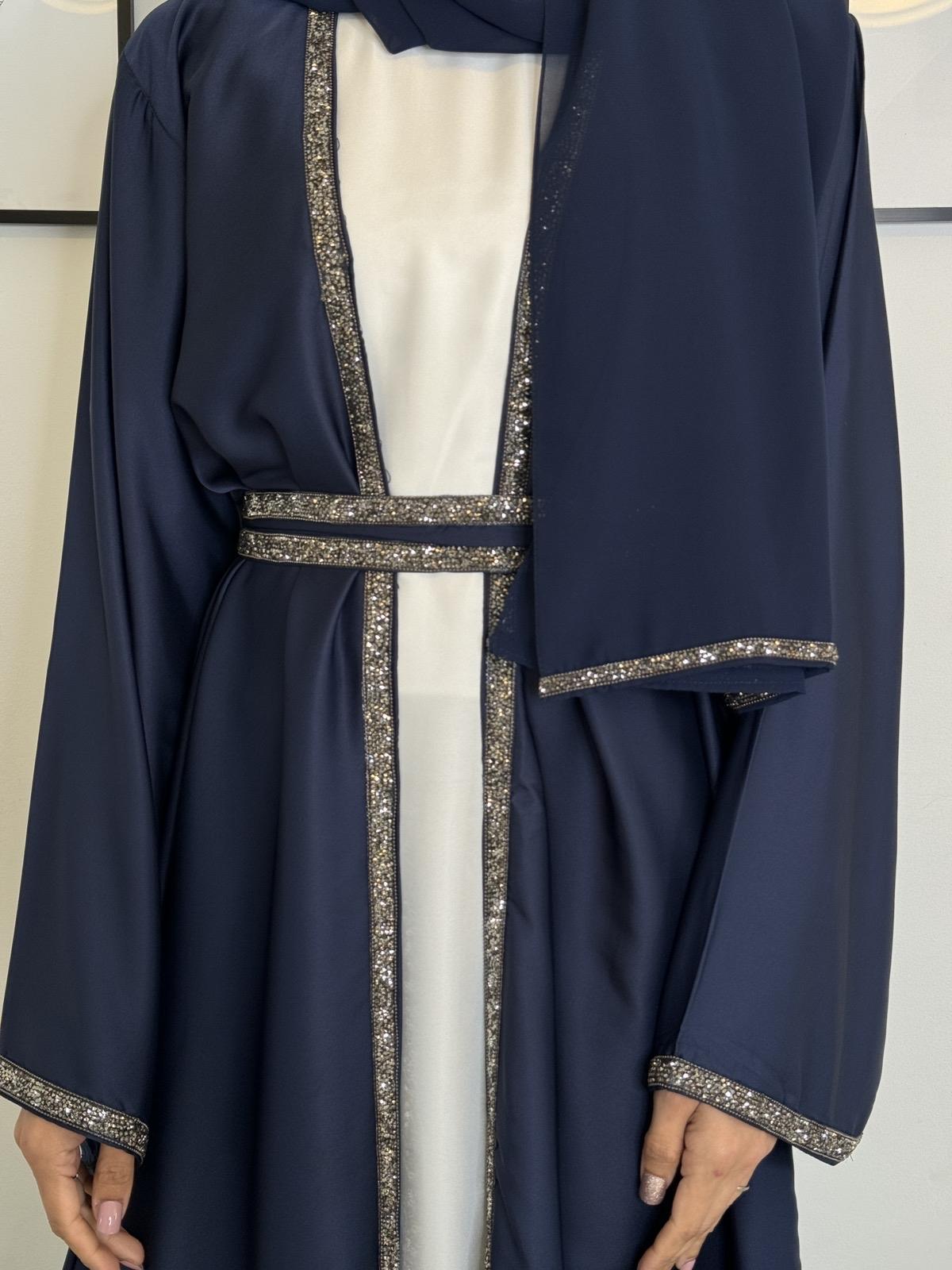 - 4-Piece Set: Includes an open abaya, matching inner dress, a coordinating hijab, and a stylish belt, all adorned with intricate embellishments.