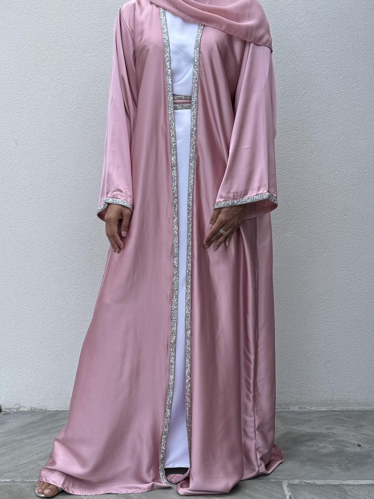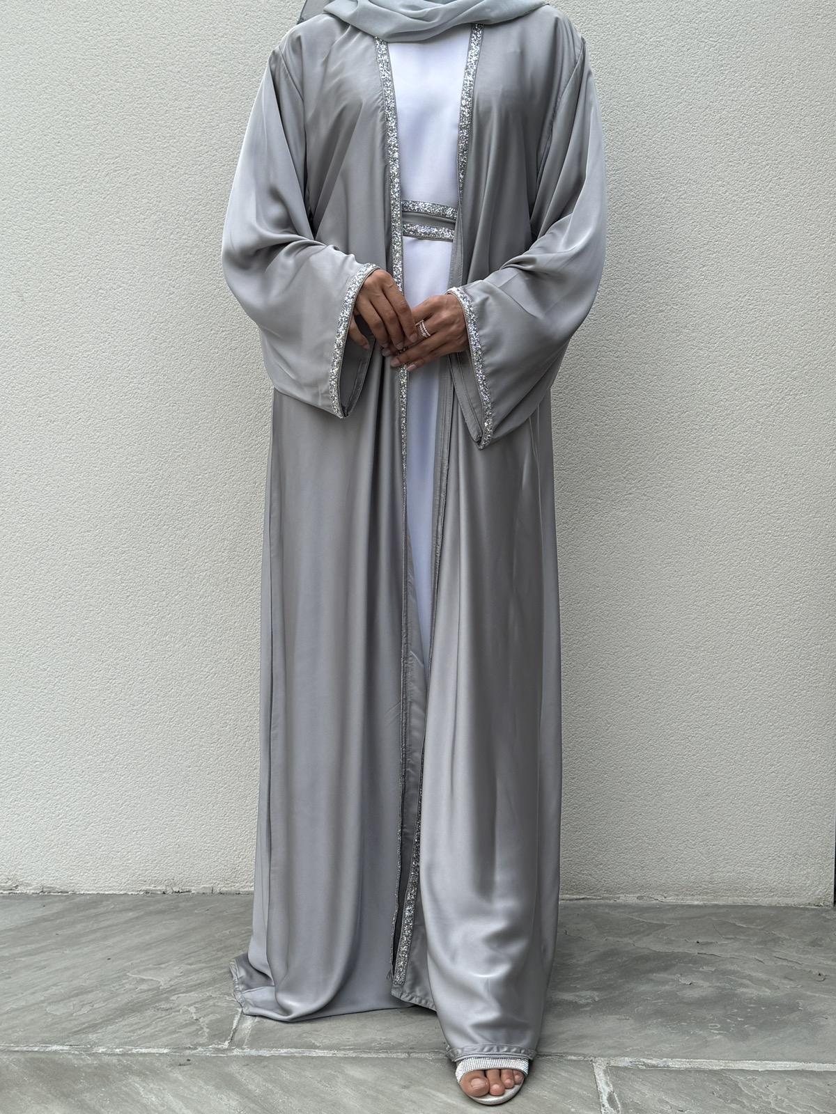Elevate your wardrobe with the Julia Luxury Silk Satin 4-Piece Abaya Set, a masterpiece of elegant design and premium craftsmanship. This exquisite abaya set is perfect for any special occasion, offering a blend of sophistication and modesty that makes it ideal for parties, weddings, and Eid celebrations.