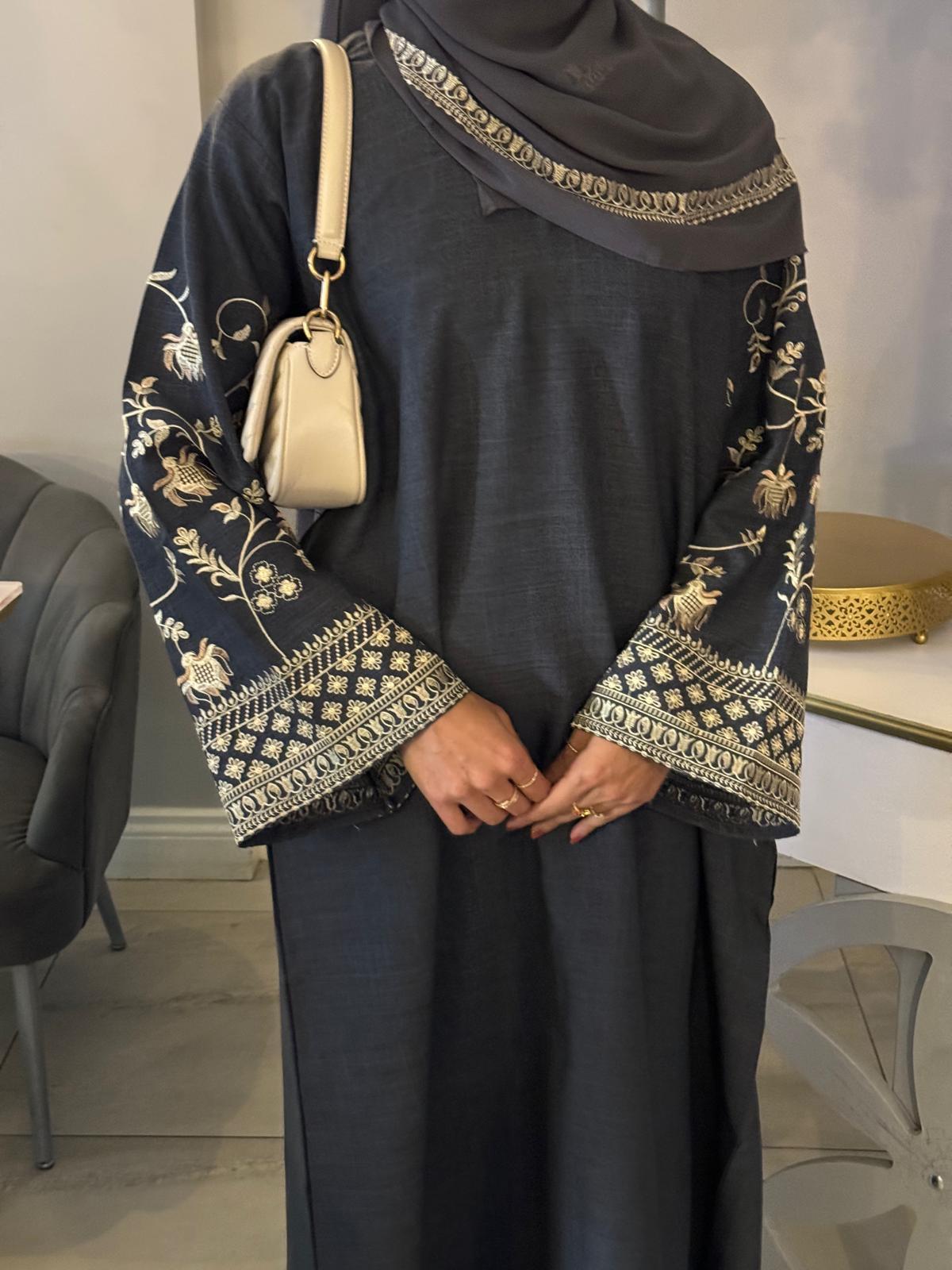 Introducing The Aafia closed abaya, a perfect addition to your wardrobe. This abaya is made in the UAE and is made of linen, which is known for its breathability and comfort. The abaya is closed and has pockets on both sides, providing convenience for carrying small items such as keys, phone, or money. The matching scarf with embroidery adds a touch of elegance and sophistication to the abaya, making it perfect for any occasion or everyday wear.