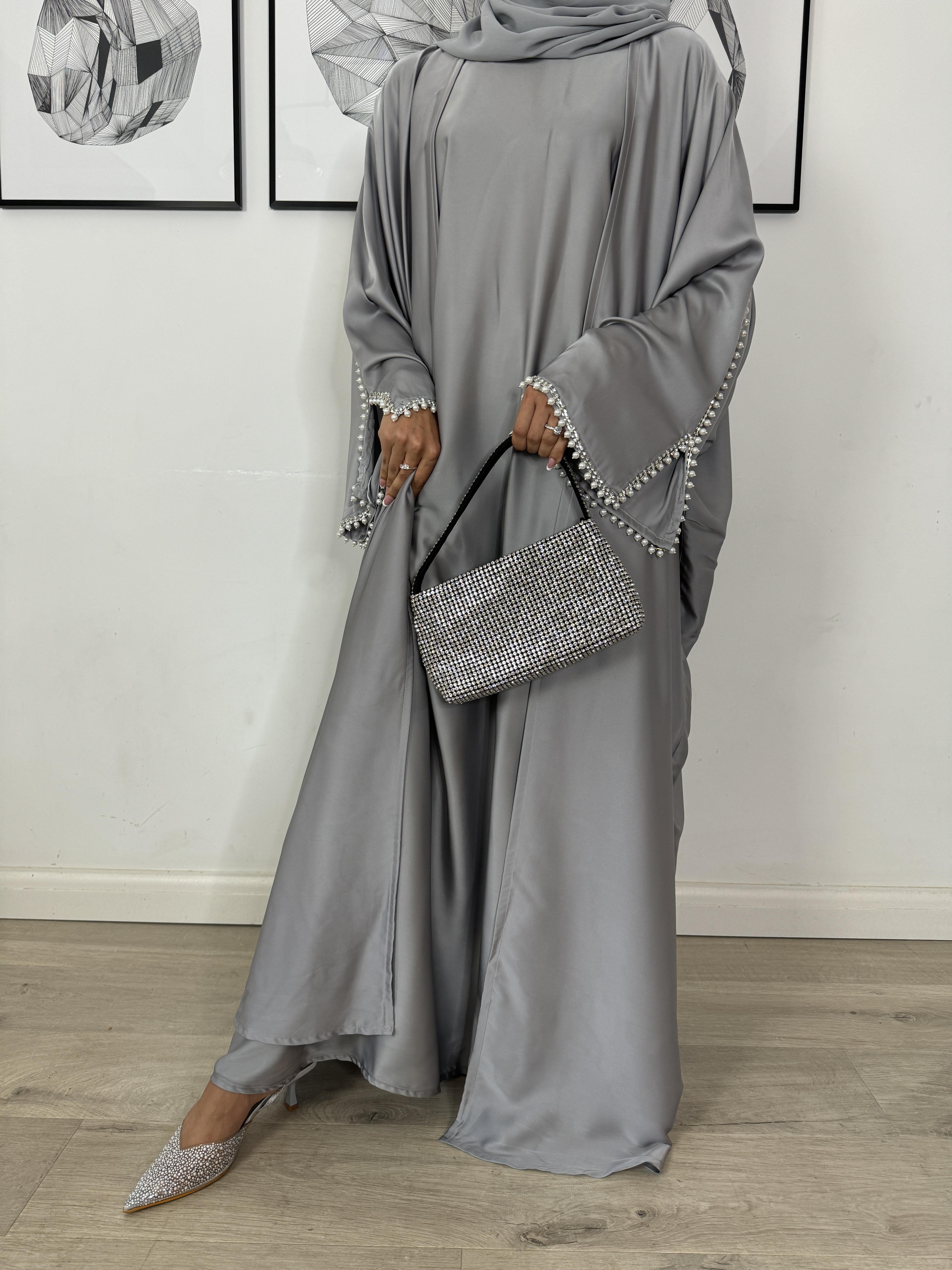 Elevate your wardrobe with the PureAbayas Lulu Abaya—a stunning 3-piece luxury set designed to exude elegance and sophistication. Crafted from premium satin, this ensemble includes an intricately embellished open butterfly-style abaya adorned with delicate pearls and shimmering diamante accents. The matching satin slip dress adds a layer of comfort and refinement, while the coordinating hijab scarf completes the look with effortless grace.